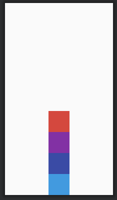 아래는 가로세로 80dp 인 빠알간색, 보라색, 남색, 하늘색 뷰를 만들고 부모에 gravity 를 center_horizontal 로 설정해 줬어. 그리고 빨간색 뷰에 android:layout_alignParentTop="true" 를 설정했고 나머지 뷰들에는 바로위에 있는 뷰의 밑에 올 수 있게끔, below 속성을"@+id/{바로 위에있는 자식 뷰}" 와 같이 설정해 줬어.